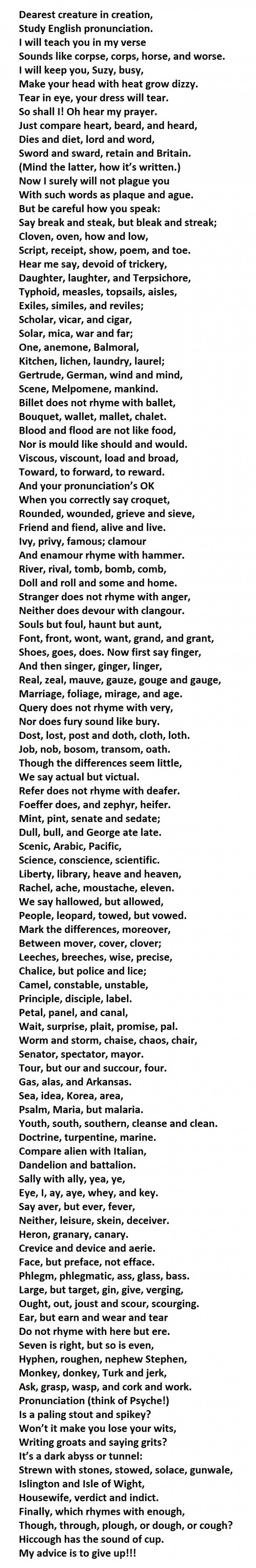 I found this on Tickld and just had to share! According to the original post, if you can pronounce correctly every word in this poem, you will be speaking English better than 90% of the native English speakers in the world. And, after trying the verses, a Frenchman said he’d prefer six months of hard labor to reading six lines aloud…